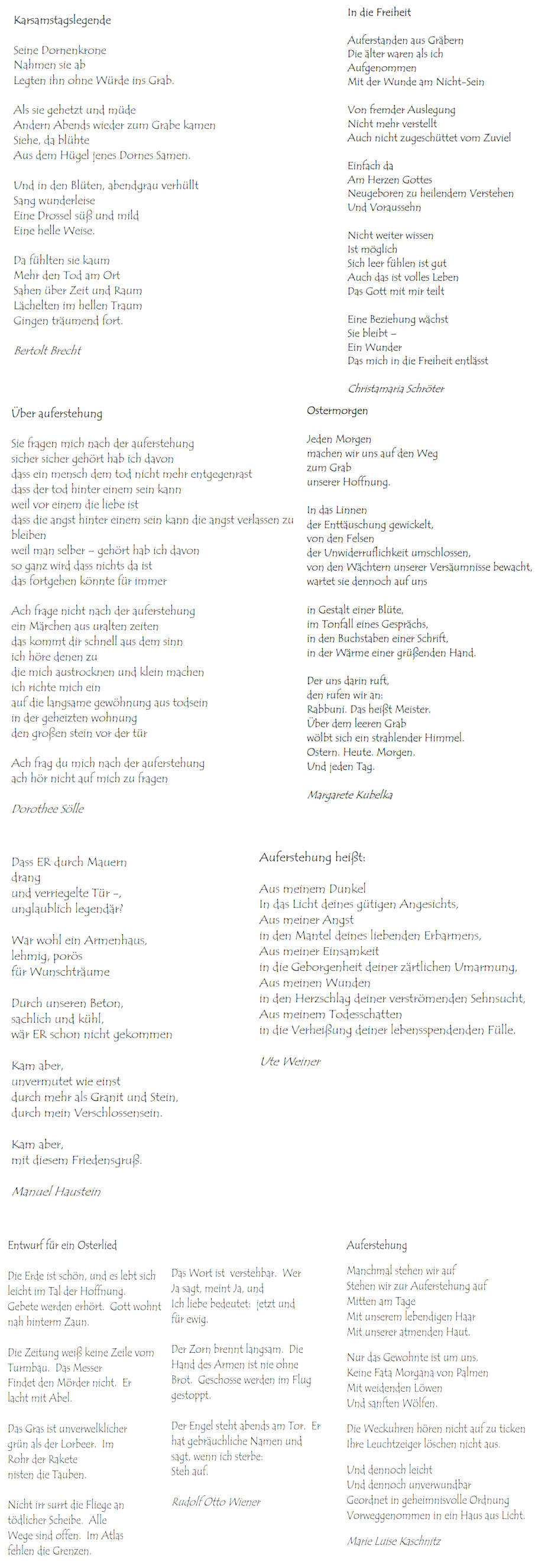 ... - und so der Satz, in den der Auferstandene für seine Freunde gerinnen läßt, daß nicht nur ihr Schmerz und ihre Trauer, sondern auch ihre Freude und ihre Lebendigkeit sich diesseits wie jenseits der Spanne zwischen Zeugung und Tod auf die immer von neuem wunder-volle Metamorphose alles von Gott in eine namentliche Existenz Gerufenen gründeten....